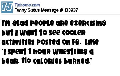 X says I'm glad people are exercising but I want to see cooler activities posted on FB. Like "I spent 1 hour wrestling a bear. 110 calories burned."