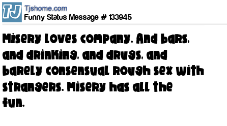 X says Misery loves company. And bars, and drinking, and drugs, and barely consensual rough sex with strangers. Misery has all the fun.