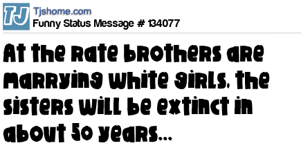 X At the rate brothers are marrying white girls, the sisters will be extinct in about 50 years...