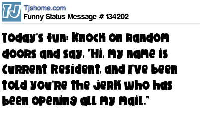 X Today's fun: Knock on random doors and say, "Hi, my name is Current Resident, and I've been told you're the jerk who has been opening all my mail."