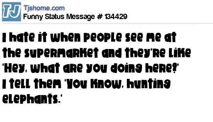 - # 72711 I hate when people see me at a grocery store and say, "Hey! What are you doing here?"... I'm like "oh you know, just hunting elephants and stuff..."