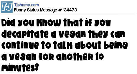 - # 127777 Did you know that if you decapitate a vegan,, they can continue to talk about being a vegan for up to another 6 minutes?