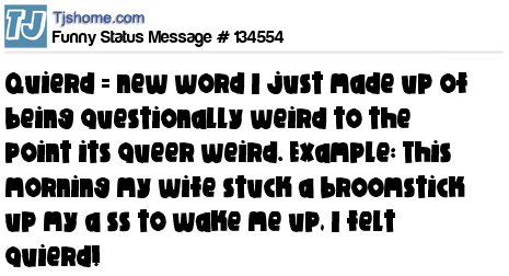 X says Quierd = new word I just made up of being questionally weird to the point its queer weird. Example: This morning my wife stuck a broomstick up my a ss to wake me up, I felt quierd!