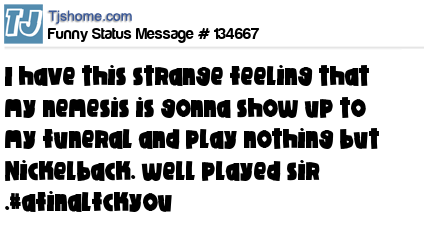 X says I have this strange feeling that my nemesis is gonna show up to my funeral and play nothing but Nickelback. well played sir .#afinalfckyou