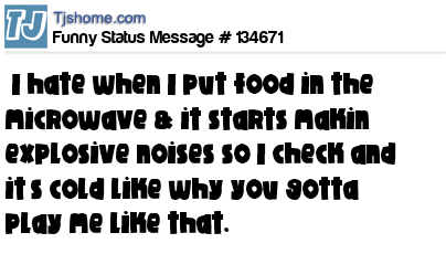 - # 140426 I hate when I put food in the microwave and it starts makin explosive noises so I check and it's cold. Like why you gotta play me like that