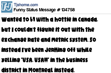 X Wanted to 69 with a hottie in Canada, but I couldn't figure it out with the exchange rate and metric system. So instead I've been jerking off while yelling "USA, USA!!" in the business district in Montreal instead.
