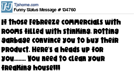 X says If those Febreeze commercials with rooms filled with stinking, rotting garbage convince you to buy their product. Here's a heads up for you........ You need to clean your freaking house!!!