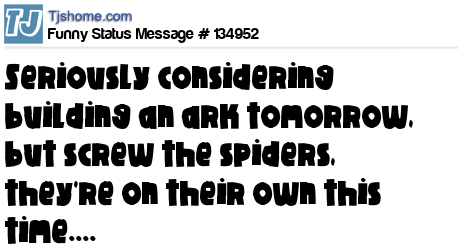 X says Seriously considering building an ark tomorrow, but screw the spiders, they're on their own this time....