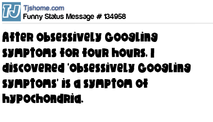 X After obsessively Googling symptoms for four hours, I discovered 'obsessively Googling symptoms' is a symptom of hypochondria.