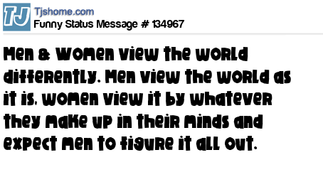 X Men & Women view the world differently. Men view the world as it is, women view it by whatever they make up in their minds and expect men to figure it all out.