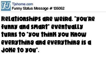 - # 134501 Relationships are weird. What starts out as "You're funny and smart" eventually turns into "You think you know everything and everything is a joke to you."