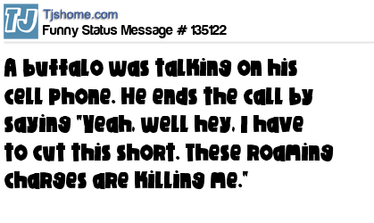 - # 140042 A buffalo was talking on his cell phone. He ends the conversation by saying "Yeah, well hey, I have to cut this short. These roaming charges are killing me."