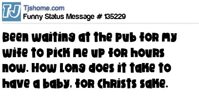 X says Been waiting at the pub for my wife to pick me up for hours now. How long does it take to have a baby, for Christs sake.
