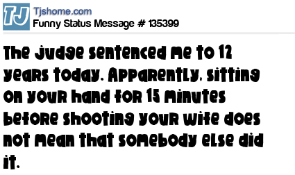 X says The judge sentenced me to 12 years today. Apparently, sitting on your hand for 15 minutes before shooting your wife does not mean that somebody else did it.