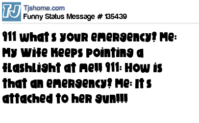 - # 180224 911: What's the emergency? Man: My wife keeps shining her laserlight pointer light on me. 911: How is that an emergency ? Man: Her laserlight pointer is attached to her gun.