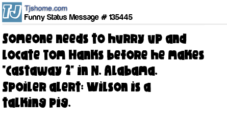 X says Someone needs to hurry up and locate Tom Hanks before he makes "Castaway 2" in N. Alabama. Spoiler alert: Wilson is a talking pig.