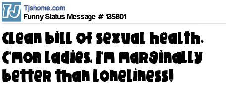 X Clean bill of sexual health. C'mon ladies, I'm marginally better than loneliness!