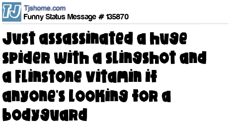 Says Just assassinated a huge spider with a slingshot and a Flintstone vitamin if anyone's looking for a bodyguard.