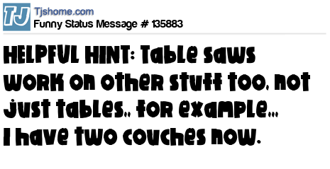 X HELPFUL HINT: Table saws work on other stuff too, not just tables,, for example,,, I have two couches now.