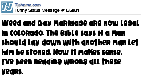 - # 145040 Colorado has legalized both marijuana and gay marriage. Leviticus 20:13 says "If a man lies with a man as he would with a woman, they should both be stoned." Wow! I've been reading it wrong all this time.