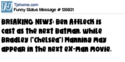 X says BREAKING NEWS: Ben Affleck is cast as the next Batman, while Bradley ("Chelsea") Manning may appear in the next eX-man movie.