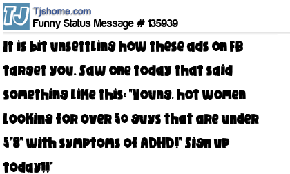 X says It is bit unsettling how these ads on FB target you. Saw one today that said something like this: "Young, hot women looking for over 50 guys that are under 5"8" with symptoms of ADHD!" Sign up today!!"