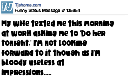 X My wife texted me this morning at work asking me to 'Do her tonight.' I'm not looking forward to it though as I'm bloody useless at impressions.....