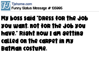 X says My boss said "Dress for the job you want, not for the job you have." Right now I am getting called on the carpet in my Batman costume.