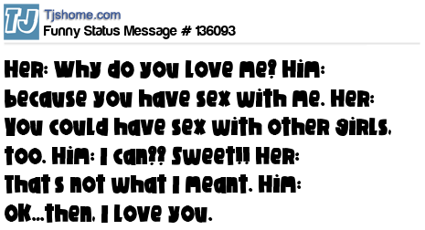 X  Her: Why do you love me? Him: because you have sex with me. Her: You could have sex with other girls, too. Him: I can?? Sweet!! Her: That’s not what I meant. Him: OK…then, I love you.