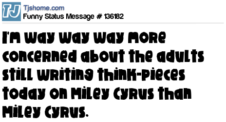 X I'm way way way more concerned about the adults still writing think-pieces today on Miley Cyrus than Miley Cyrus.