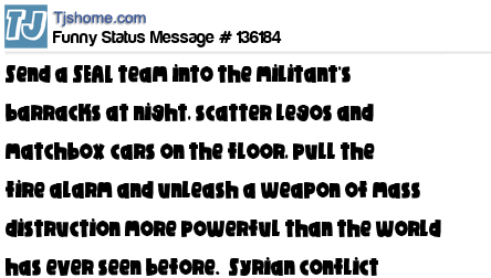 X says Send a SEAL team into the militant's barracks at night, scatter legos and matchbox cars on the floor, pull the fire alarm and unleash a weapon of mass distruction more powerful than the world has ever seen before. Syrian conflict solved!