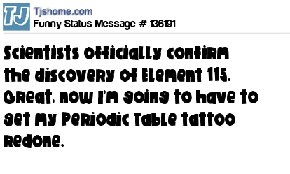 X says Scientists officially confirm the discovery of Element 115. Great, now I'm going to have to get my Periodic Table tattoo redone.