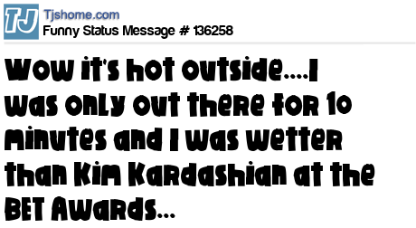 - # 105357 It's so hot outside! I've been out here 10 minutes and I'm already wetter then Kim Kardashian at the BET Awards.