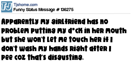 X says Apparently my girlfriend has no problem putting my d*ck in her mouth but she won't let me touch her if I don't wash my hands right after I pee coz that's disgusting.