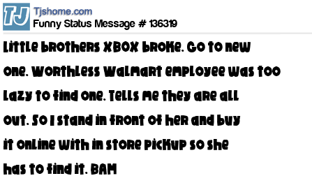 X says Little brothers XBOX broke. Go to new one. Worthless Walmart employee was too lazy to find one. Tells me they are all out. So I stand in front of her and buy it online with in store pickup so she has to find it. BAM