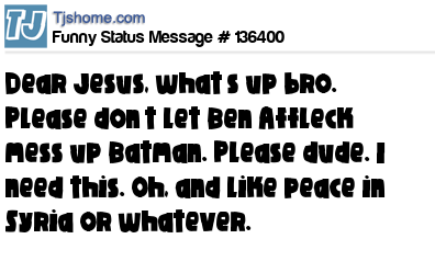 X says Dear Jesus, what’s up bro. Please don’t let Ben Affleck mess up Batman. Please dude. I need this. Oh, and like peace in Syria or whatever.