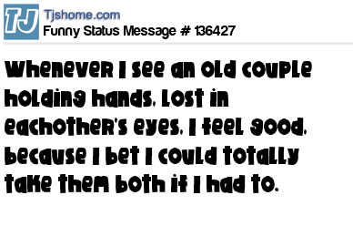 X says Whenever I see an old couple holding hands, lost in eachother's eyes, I feel good, because I bet I could totally take them both if I had to.