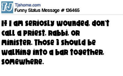 X says If I am seriosly wounded, don't call a priest, rabbi, or minister. Those 3 should be walking into a bar together, somewhere.