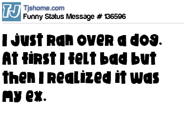 X says I just ran over a dog. At first I felt bad but then I realized it was my ex.