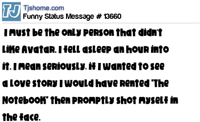 X is I must be the only person that didn't like Avatar. I fell asleep an hour into it. I mean seriously, if I wanted to see a love story I would have rented "The Notebook" then promptly shot myself in the face.