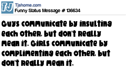 X says Guys communicate by insulting each other, but don't really mean it. Girls communicate by complimenting each other, but don't really mean it.