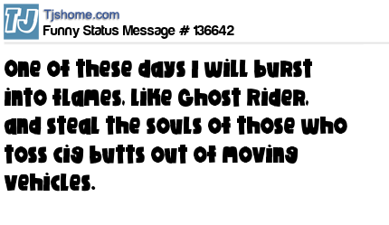 X says One of these days I will burst into flames, like Ghost Rider, and steal the souls of those who toss cig butts out of moving vehicles.