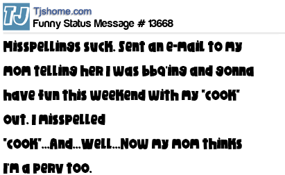 X is Misspellings suck. Sent an e-mail to my mom telling her I was bbq'ing and gonna have fun this weekend with my "cook" out. I misspelled "cook"...And...Well...Now my mom thinks I'm a perv too.