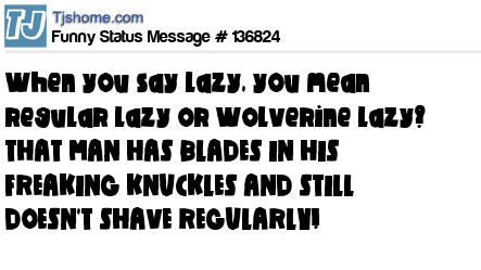 X says When you say lazy, you mean regular lazy or Wolverine lazy? THAT MAN HAS BLADES IN HIS FREAKING KNUCKLES AND STILL DOESN'T SHAVE REGULARLY!