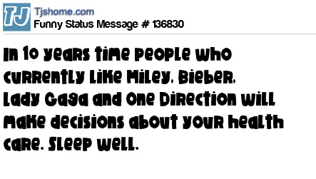 X says In 10 years time people who currently like Miley, Bieber, Lady Gaga and One Direction will make decisions about your health care. Sleep well.