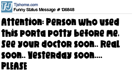 X Attention: Person who used this porta potty before me, See your doctor soon.. Real soon.. Yesterday soon.... PLEASE