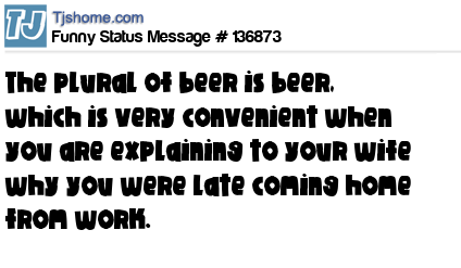 X says The plural of beer is beer, which is very convenient when you are explaining to your wife why you were late coming home from work.