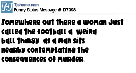 X says Somewhere out there a woman just called the football a “weird ball thingy” as a man sits nearby contemplating the consequences of murder.