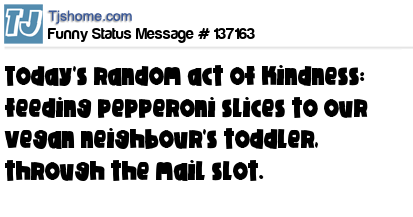 - # 135942 Today's random act of kindness: feeding pepperoni slices to our vegan neighbor's 3 year old, through the mail slot.
