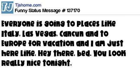 X says Everyone is going to places like Italy, Las Vegas, Cancun and to Europe for vacation and I am just here like, Hey there, bed. You look really nice tonight.